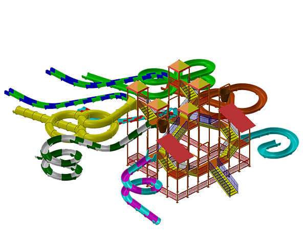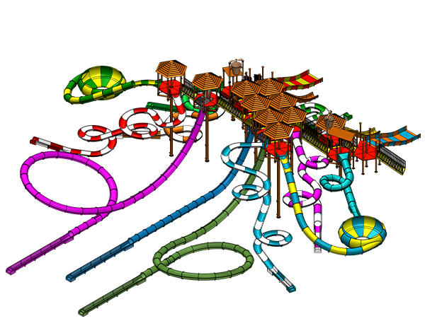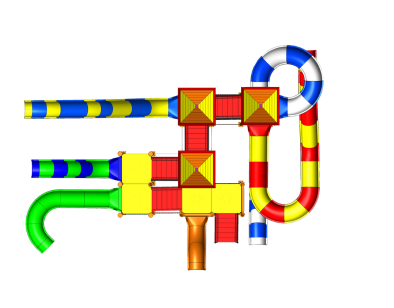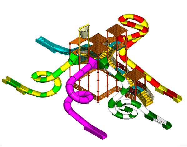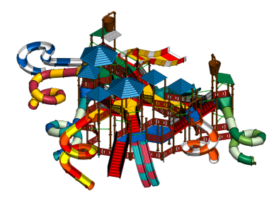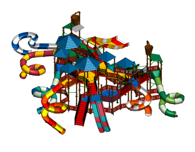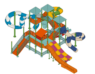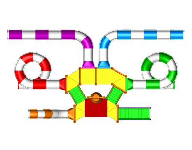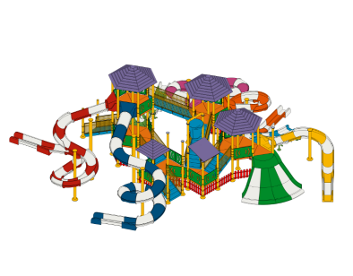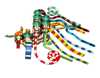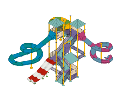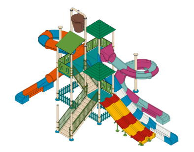 This ship-themed water park attraction is a fantastic blend of adventure and fun! It features multiple water slides, some open and some enclosed, winding their way around the ship’s structure. There are also interactive elements like water cannons and tipping buckets, all adorned with pirate flags and motifs. The detailed design, including masts, rigging, and even pirate figures, creates an immersive experience that transports visitors to the high seas for a thrilling day of aquatic escapades. It’s truly a treasure trove of watery entertainment!