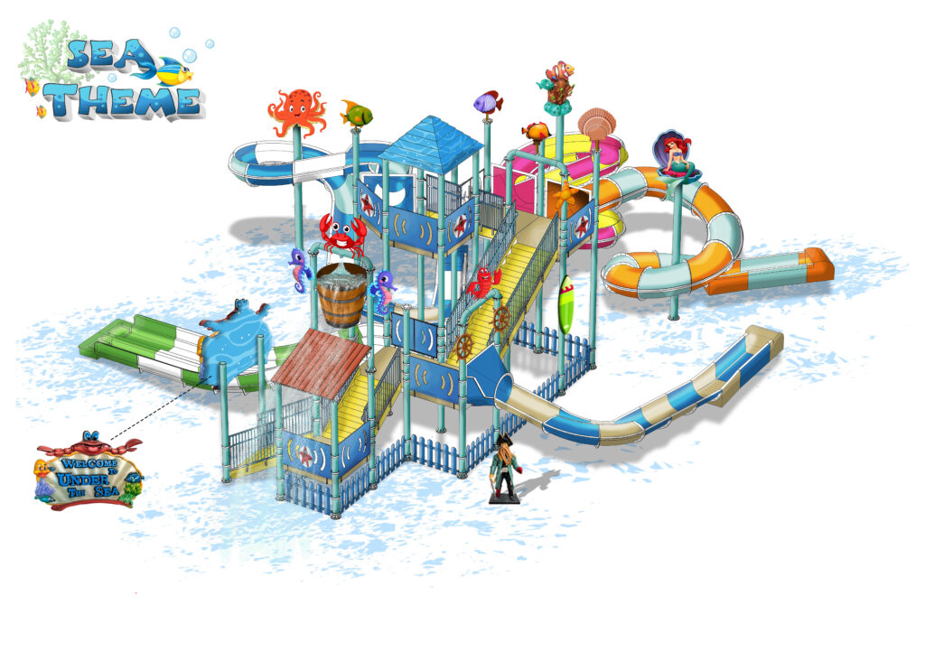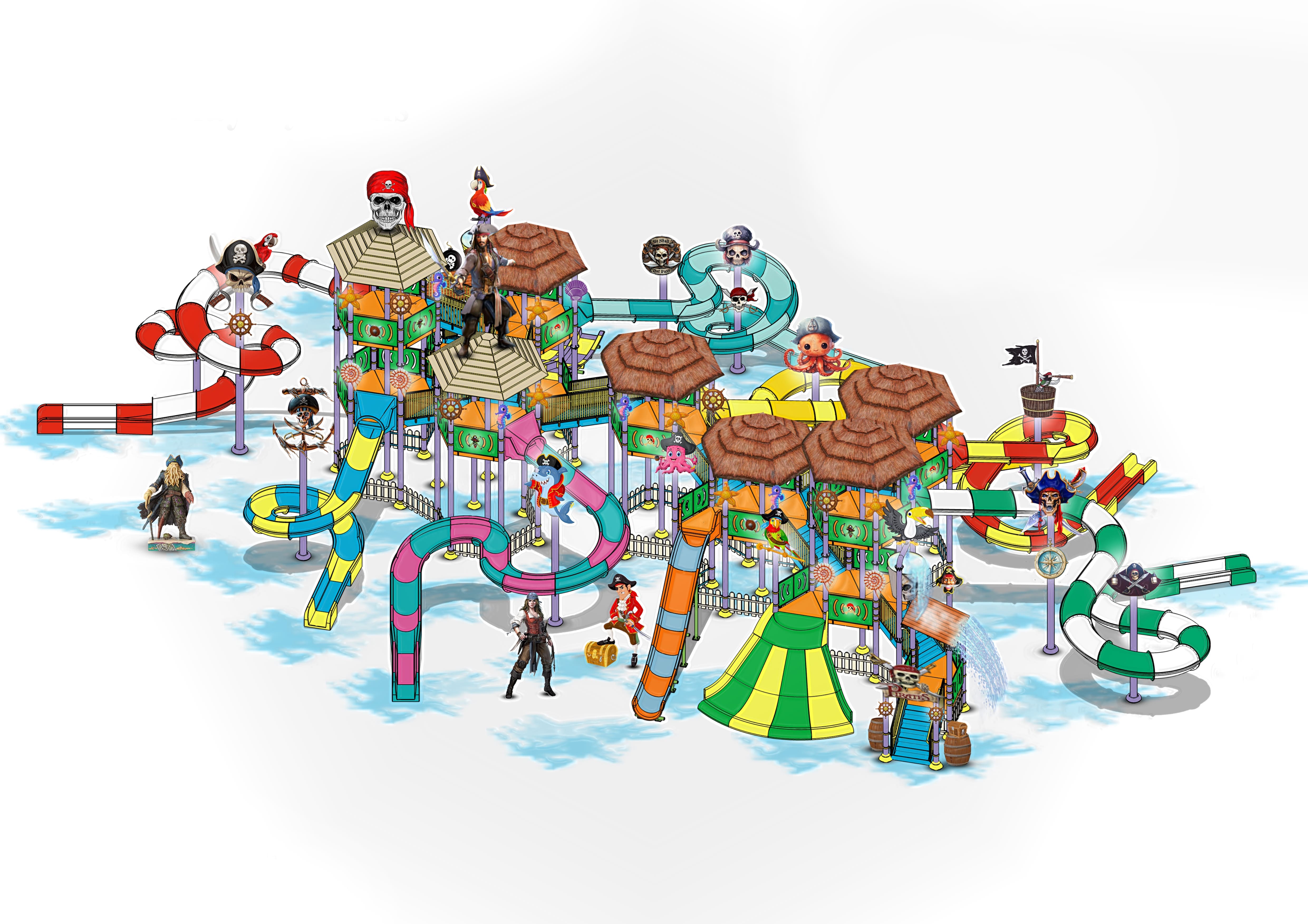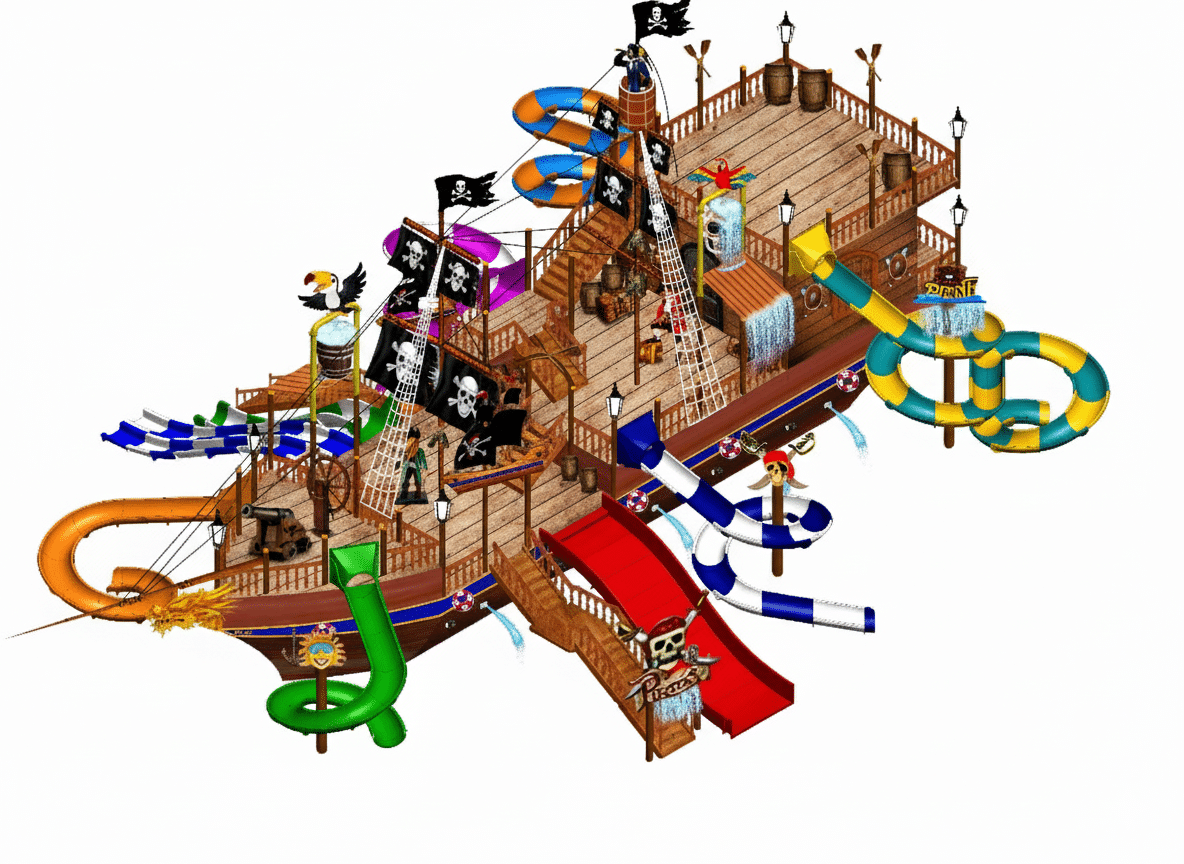 A sea-themed water park attraction, much like this pirate ship, plunges visitors into an underwater world of wonder and excitement. It often features vibrant marine life decorations, wave pools mimicking ocean currents, and slides shaped like sea creatures or intertwining like kelp forests. Elements like bubbling geysers, mist effects, and even sandy play areas can further enhance the illusion of being by or in the ocean. This theme creates an immersive, refreshing escape, perfect for those who dream of deep-sea adventures and aquatic thrills.